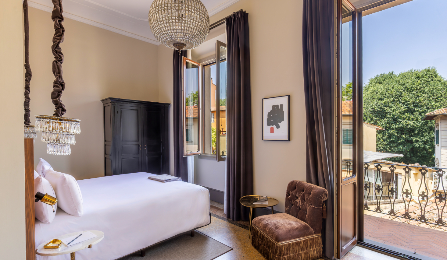 Stepping inside is a revelation: original Venetian tile flooring lies beneath soaring ceilings, and interiors are infused with a luxurious, modern baroque style. An exceptional art collection features everything from hand-restored frescoes and 16th-century masters like Jacob de Baecker to bold works by Dalí. Privacy is paramount, with every residence offering a private kitchen, dining area, and its own terrace or garden. It all culminates in a communal rooftop terrace that provides unmatched views over historical Florence.